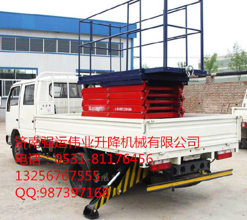 產(chǎn)品規(guī)格:本類產(chǎn)品根據(jù)升降高度可分為4、6、8、10米升降平臺(tái),設(shè)備載重300公斤至500公斤,客戶可根據(jù)需求選用解放、東風(fēng)、輕騎、福田、電瓶車(chē)等任何車(chē)型,設(shè)備直接采用汽車(chē)或電瓶的直接動(dòng)力升降。